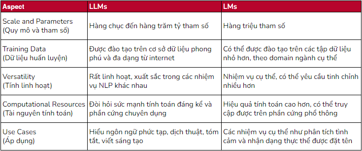 LLM và LM đơn giản hơn khác nhau chủ yếu về quy mô, độ phức tạp và nhiệm vụ mà chúng được thiết kế để thực hiện. Dưới đây là so sánh giữa các mô hình ngôn ngữ lớn và các mô hình đơn giản hơn: